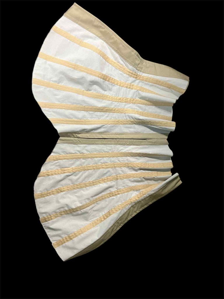 A practical note from experience. In corsets of this type it is usually better to select a lining fabric with a similar weight to the outer fabric. Choosing a lighter fabric is not technically wrong but it can result in visible wrinkling, as happened in my finished corset. Many original museum corsets show similar wrinkling, so this is not a serious flaw.