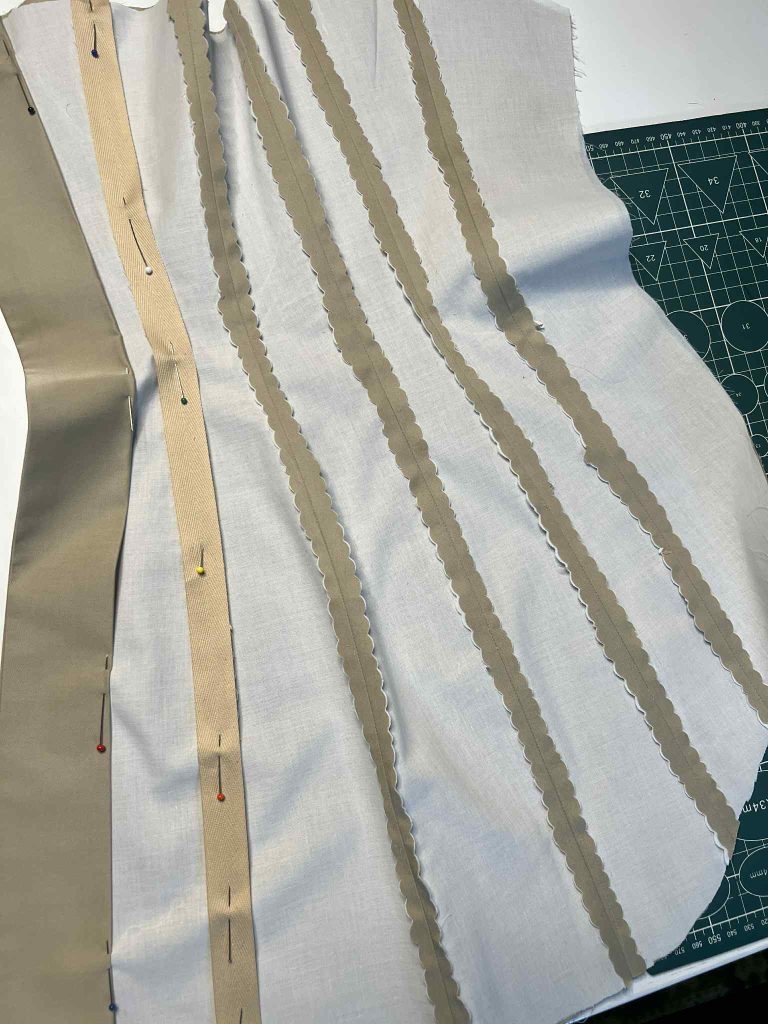 This is how everything began to look after the boning channel tapes were sewn in. Remember that the bones are not inserted to the full length. Otherwise sitting would not be possible. The pattern clearly marks the points up to which the bones should be inserted and where they must end.