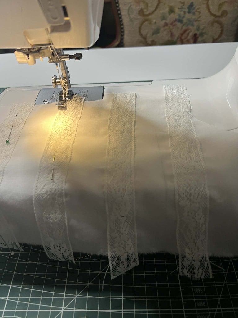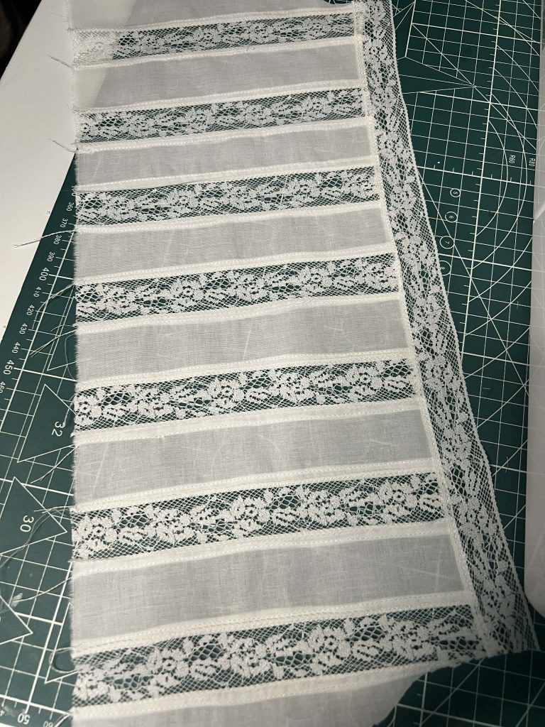 I stitched all the pieces together using a French seam, so there are no raw edges visible from the outside. At the very end, I finished the top and bottom of the chemise by hand, and I added a lace trim—of course, I attached it the wrong way around, but I only noticed that later!
