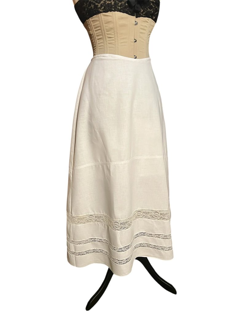 This petticoat isn’t boring, but the original pattern didn’t look quite the way I wanted it to, so I ended up modifying it a bit. I added ruffles of English embroidery, lace inserts, and a ribbon drawstring. Either way, it doesn’t look exactly like the illustration—I know that was just a marketing trick—but as a base for the petticoat, it works nicely, because the top is very well shaped. As I said, if you want the effect shown in the illustration, add more fabric to the lower part for width and gather it slightly.