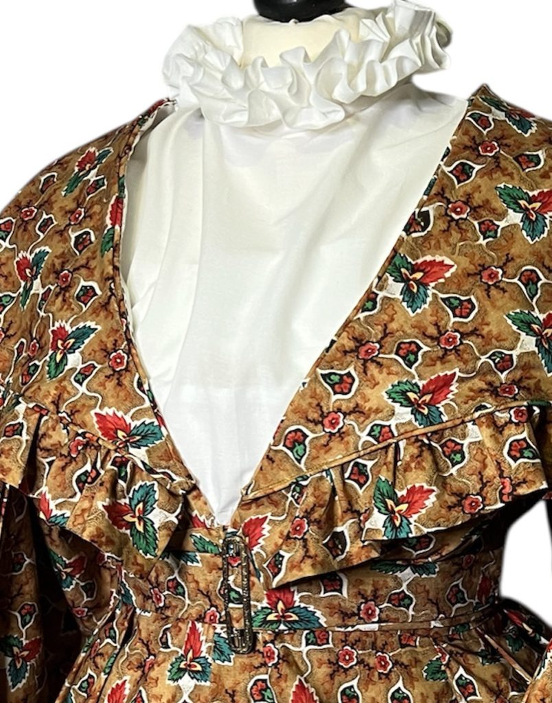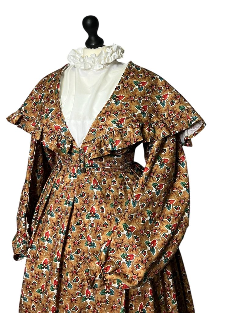 The pelerine is attached to the gown using tabs and small buttons, allowing it to be secured at the back of the neck with a single button, while the loop is hidden inside the bodice. The same system is used at the front. I also added two hooks at mid-neckline to ensure it fits closely. Overall, I’m very pleased with the result. I plan to use this pattern, with minor modifications, to make a winter gown with fur trim.
