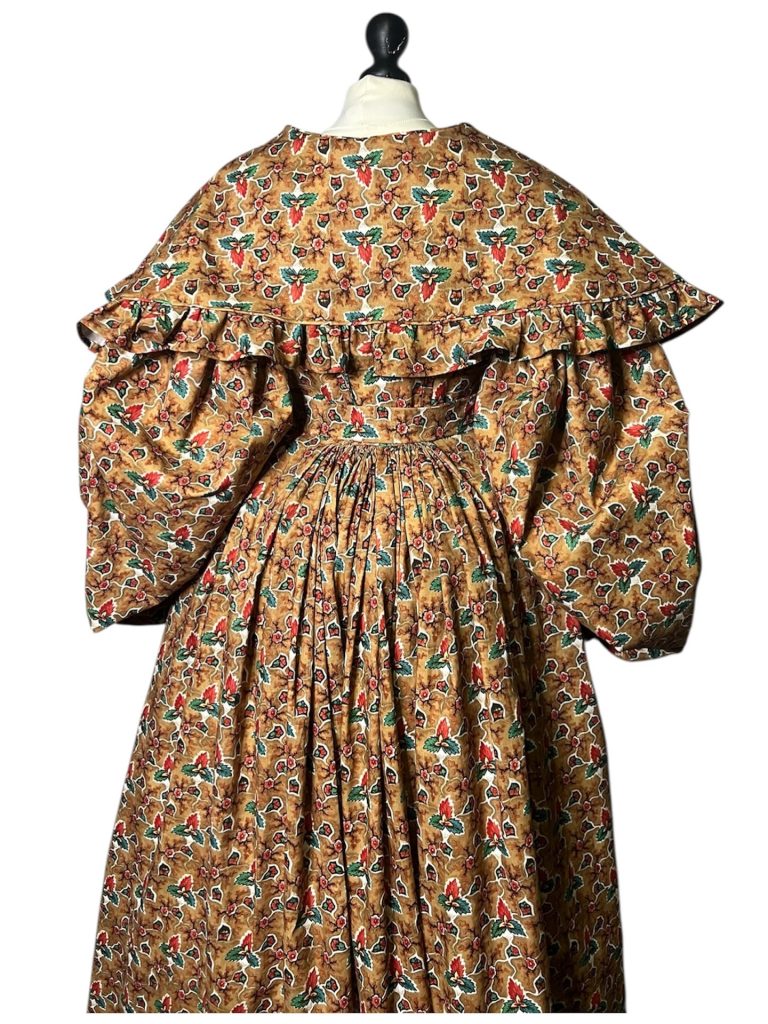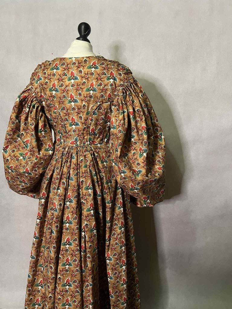 Even so, a portion of the gown still pulls heavily toward the back, causing the front to lift slightly. A similar issue was noted by another person testing this pattern. It is possible that the front of the gown may need to be slightly lengthened, as the problem stems from the weight of our modern fabrics — they are heavier compared to the printed cottons of the 1830s. Even though I chose Creston, a very fine cotton fabric, it is still unfortunately quite heavy.