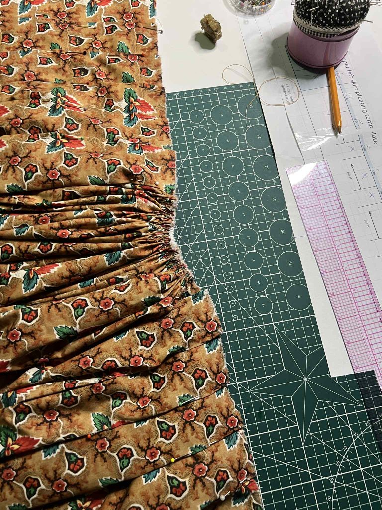Now, about the pleats of the skirt. This part required a bit of work, as they run toward the front of the gown. I followed the pattern layout, and the pleats are slightly asymmetrical: one side has more pleats than the other, and they vary in width. This doesn’t surprise me, as not everything in period garments was perfectly measured — the skirt may have been widened or narrowed at some point, or perhaps it was originally like this. I created the pleats on both the left and right sides, leaving fabric in between without pleats, which was intended for gathering.