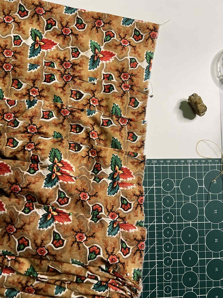 Hi! Today’s episode is another stage of working on the gown from the Genesee Country Village & Museum collection, today it’s all about the skirt. The skirt pattern itself was very simple: 3.3 meters of fabric, with a length roughly from the waist to the ankles. To maintain the aesthetic of the period, it’s worth keeping it slightly shorter so that the ankles remain visible.